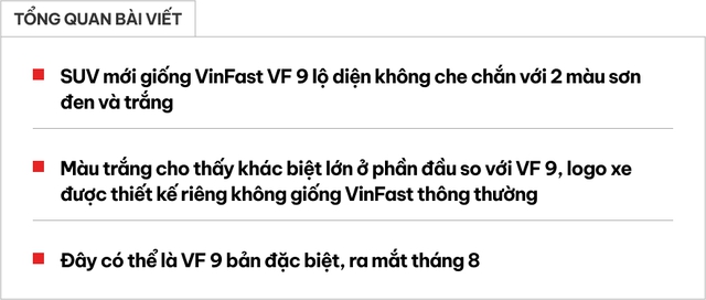 Trước đó, chiếc màu sơn đen cũng xuất hiện với logo mới. Tuy nhiên, logo phần đầu của chiếc xe sơn đen được gắn ở trên dải LED định vị ban ngày thay vì trên nắp ca-pô. Logo đuôi xe giống mô phỏng lại cánh chim, không giống logo VinFast thông thường. Cả phần đầu và đuôi xe đều khác hẳn so với VF 9, ngoại trừ dải đèn LED hậu vắt ngang có thiết kế tương đồng.