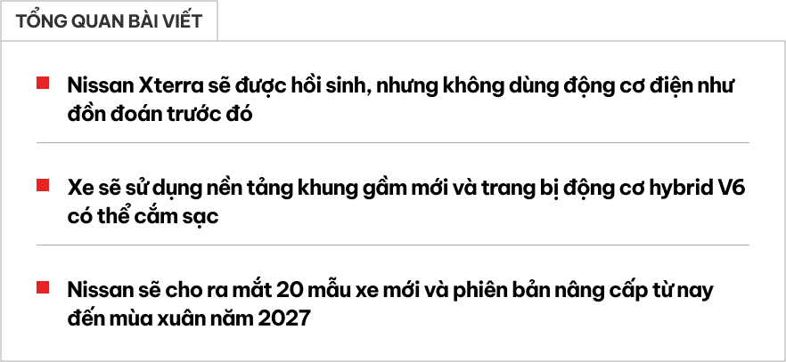 Theo báo cáo của Automotive News, Nissan cam kết ra mắt 20 mẫu xe mới và nâng cấp tại Mỹ và Canada vào mùa xuân năm 2027. Thông tin này được đưa ra cũng trong cuộc họp trên. Không chỉ Xterra, Nissan cũng xác nhận sẽ ra mắt Infiniti Q50 sedan mới, trang bị động cơ V6 twin-turbo 400 mã lực và hộp số sàn 6 cấp từ chiếc xe thể thao Z. Hãng cũng sẽ sớm ra mắt thêm nhiều mẫu xe hybrid tại Mỹ, và Leaf sẽ trở lại với phiên bản crossover chạy điện giá cả phải chăng.