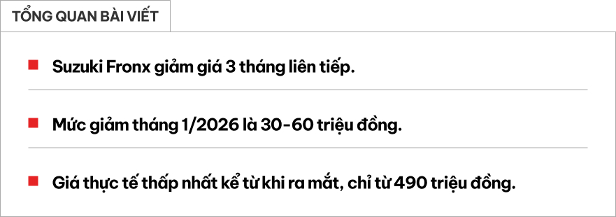 Tháng đầu tiên sau khi ra mắt mức giảm chỉ là 10-45 triệu đồng tùy phiên bản, giá khởi điểm thực tế của Fronx giữ ở mức 510 triệu đồng. Tuy nhiên, con số này giảm xuống chỉ còn 494 triệu đồng vào tháng 11/2025 khi bản GL tiêu chuẩn được giảm 26 triệu đồng và nay mức giảm của Fronx tăng lên từ 30 triệu đồng và cao nhất ở mức 60 triệu đồng, đưa khởi điểm xuống còn 490 triệu đồng.