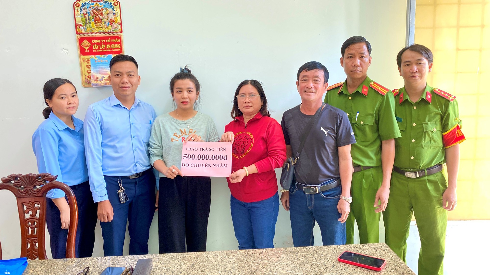 Công an xã Tri Tôn cùng đại diện Ngân hàng Vietinbank và chị Như trao trả số tiền 500 triệu đồng cho bà Ca