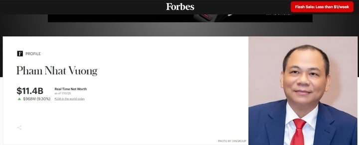 Theo cập nhật thời gian thực sáng 11/7 (giờ Việt Nam) của Forbes , ông Phạm Nhật Vượng, Chủ tịch Vingroup sở hữu khối tài sản 11,4 tỷ USD, xếp thứ 238 trong danh sách người giàu thế giới, tăng 25 bậc so với ngày trước đó.