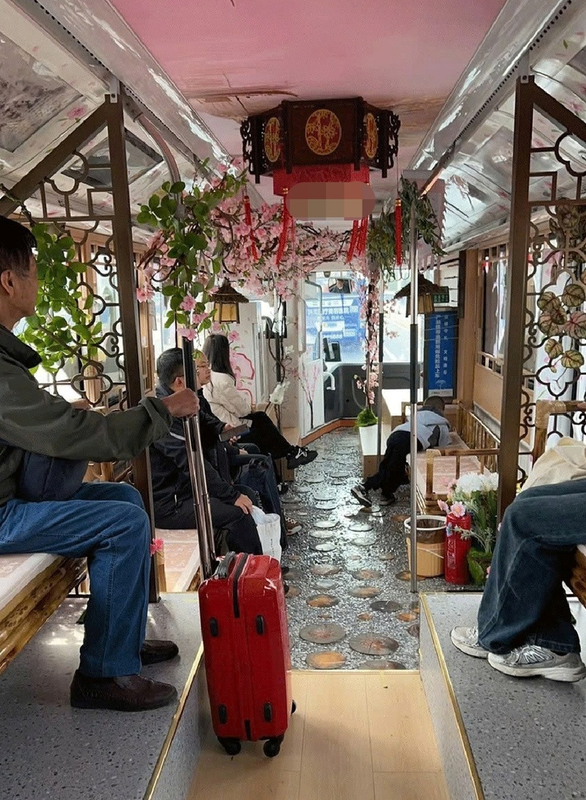 Không gian bên trong xe cũng được "hô biến" với khung cửa gỗ chạm khắc, đèn lồng, hoa nhựa và ghế tre. Ảnh: Sixthtone.
