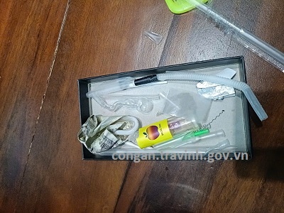 Tại hiện trường, lực lượng công an tạm giữ 3 đoạn ống nhựa trong suốt, bên trong có chứa tinh thể rắn, 3 bộ dụng cụ sử dụng trái phép chất ma túy, trong đó có đoạn thủy tinh còn chứa tinh thể nghi là chất ma túy; 2 bịch nhựa trong suốt, bên trong có chứa tinh thể rắn và 4 đoạn ống thủy tinh bên trong chứa chất nghi là ma túy và nhiều vật dụng khác có liên quan.