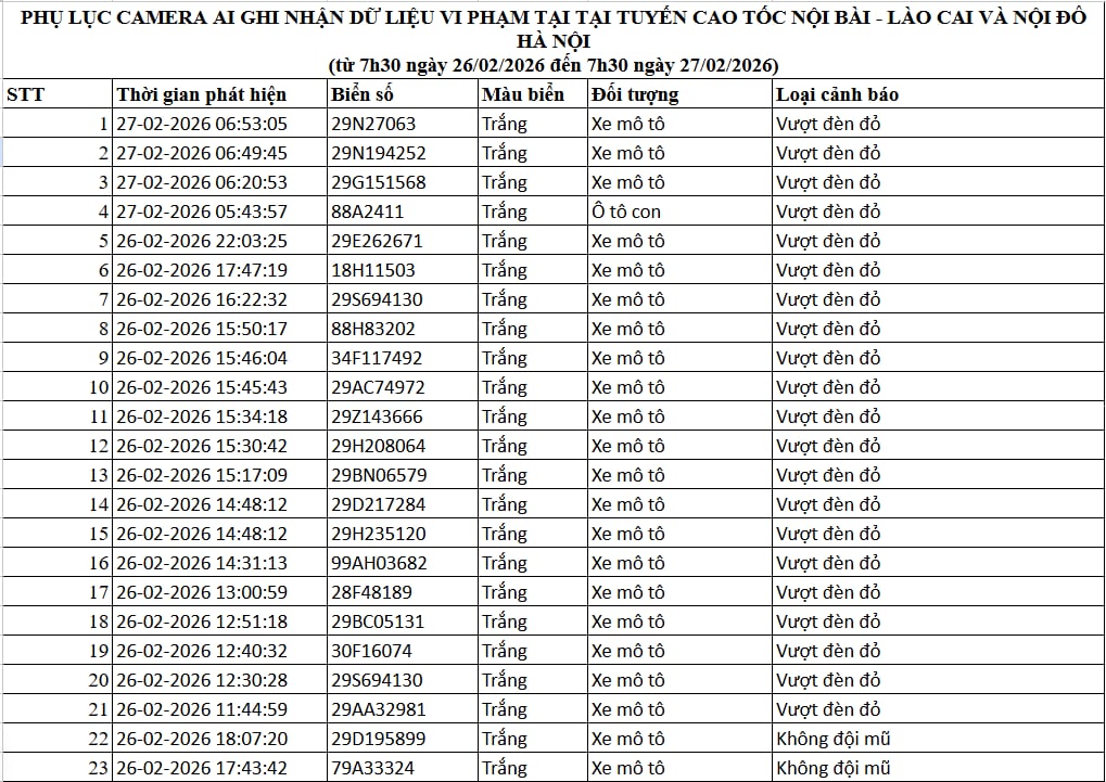 Cụ thể, từ 7 giờ 30 phút ngày 26/2 đến 7 giờ 30 phút ngày 27/2, camera AI tại km20 tuyến cao tốc Nội Bài - Lào Cai ghi nhận có 8.339 phương tiện đi qua với tốc độ trung bình là 68km/h. Tại đây, lực lượng chức năng phát hiện 4 trường hợp người điều khiển xe ô tô không thắt dây đai an toàn.