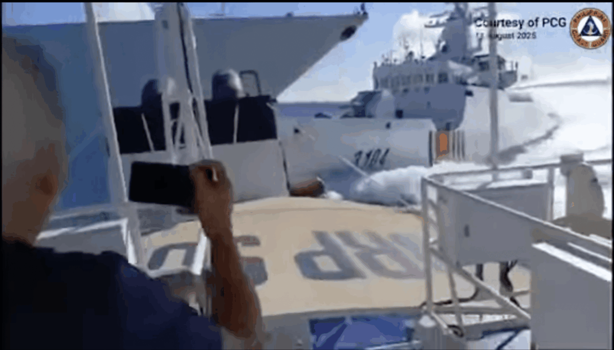 Hình ảnh từ đoạn phim do Cảnh sát biển Philippines công bố về vụ va chạm giữa các tàu Hải cảnh và Hải quân Trung Quốc sáng ngày 11/8/2025 ở vùng biển gần bãi cạn Scarborough