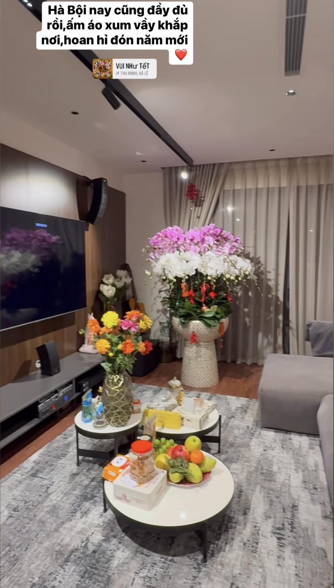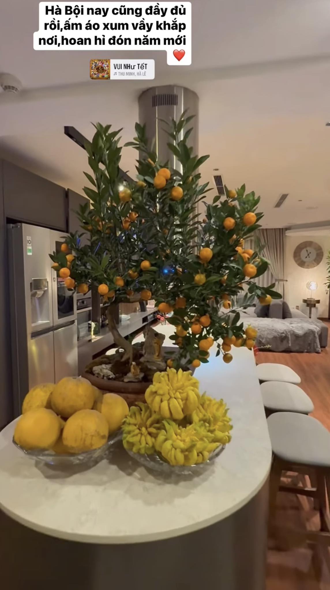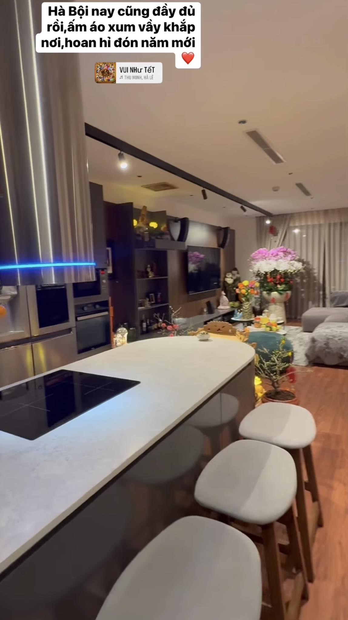 Mới đây, nữ ca sĩ đã đăng tải video khoe không gian bên trong căn chung cư cao cấp ở Hà Nội những ngày sát Tết. Cô còn không quên kèm theo dòng trạng thái bày tỏ cảm xúc hứng khởi của bản thân :‘‘Hà Nội nay cũng đầy đủ rồi, ấm áo xum vầy khắp nơi, hoan hỷ đón năm mới’’.