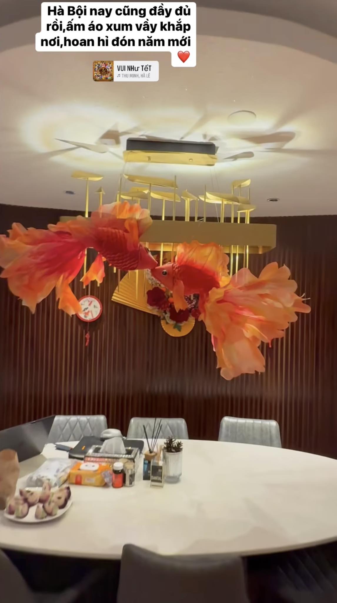 Chưa hết, ở góc phòng, Lệ Quyên đặt hẳn một cây bưởi sai trĩu quả để chào đón năm mới. Tại khu vực bàn ăn, ‘‘nữ hoàng phòng trà’’ còn mạnh tay chi tiền sắm về mô hình cá chép nổi bật và set quạt giấy treo tường để không gian thêm màu sắc. Ngoài ra, nhiều phụ kiện trang trí nho nhỏ cũng được nữ ca sĩ sử dụng để treo trên tường.