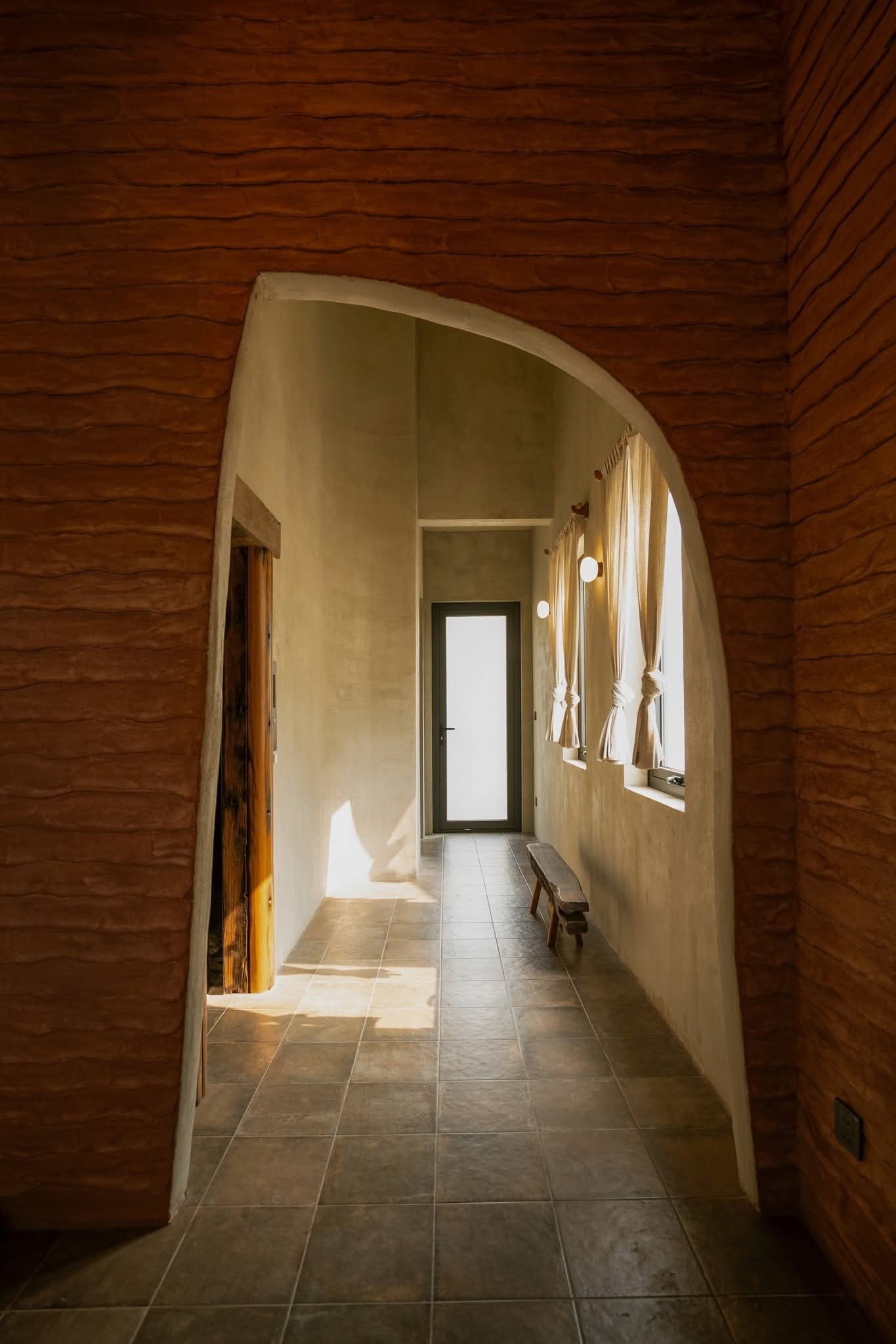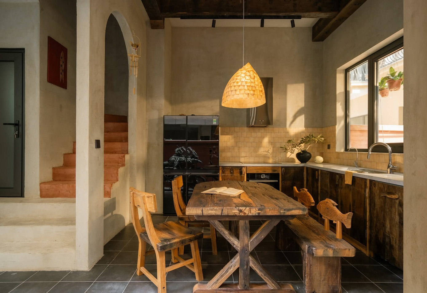 Tinh thần thô mộc không chỉ được thể hiện qua nội thất gỗ mà còn hiện diện qua tường hiệu ứng, vật liệu gạch, đá, đường nét bất đối xứng, bất toàn khắp mọi ngóc ngách.