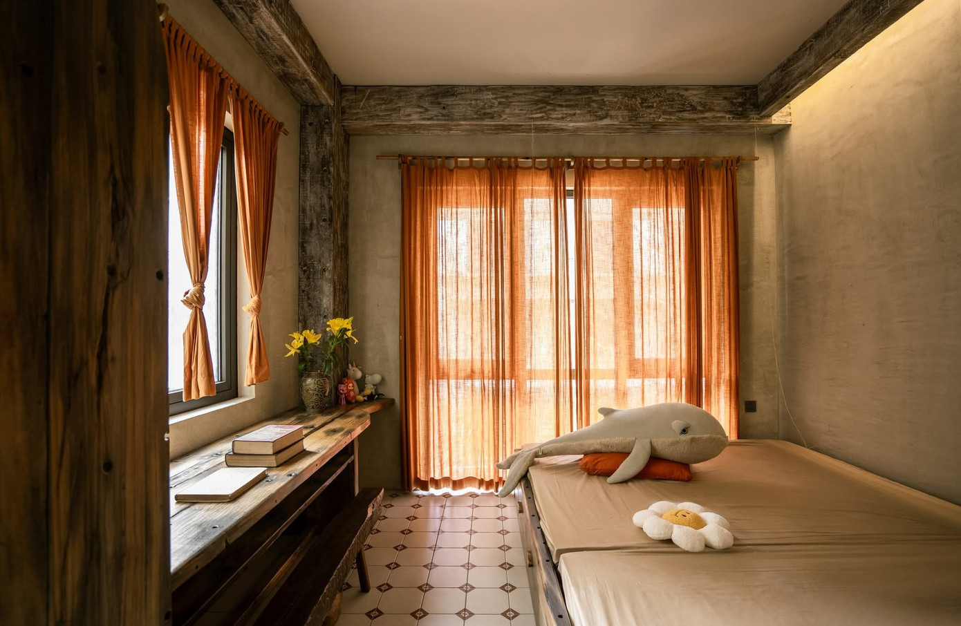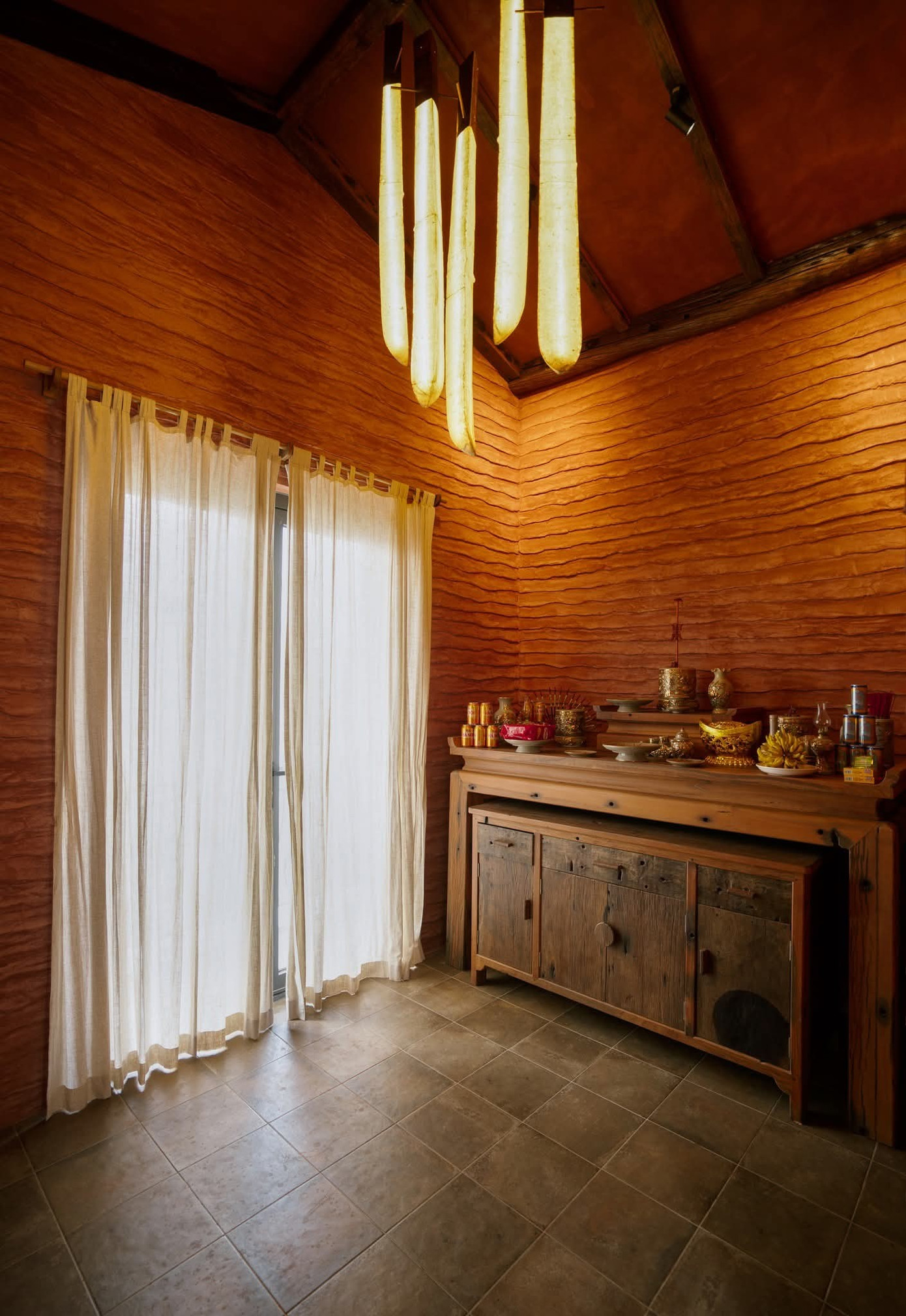 Không gian với tính cách thô mộc và những mảng màu mạnh cá tính. Nội thất gỗ Táu tái sinh từ thuyền cũ và đầy ắp đồ thủ công, vải lanh, đèn giấy,... biến nơi này thành một "hang động" đầy cảm hứng.