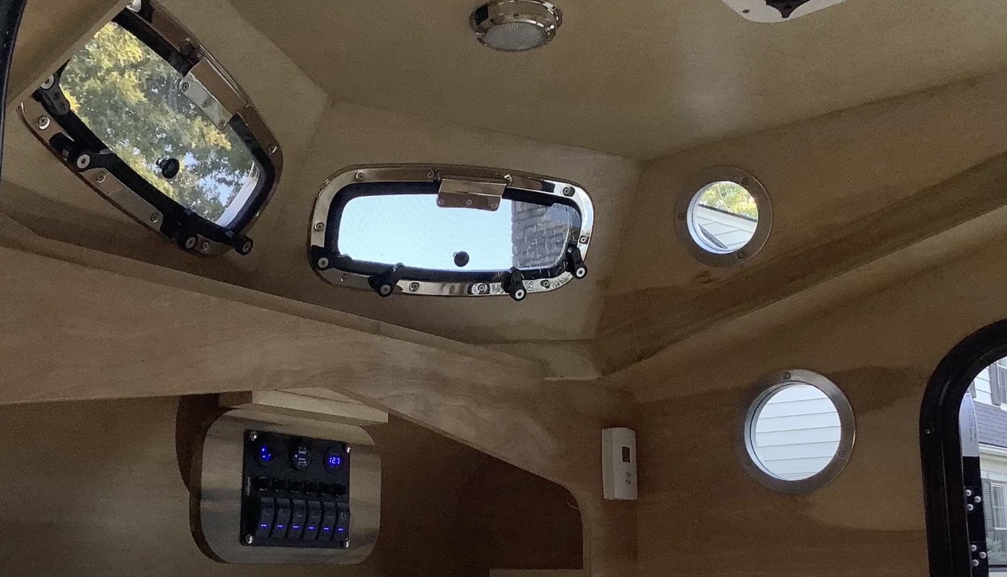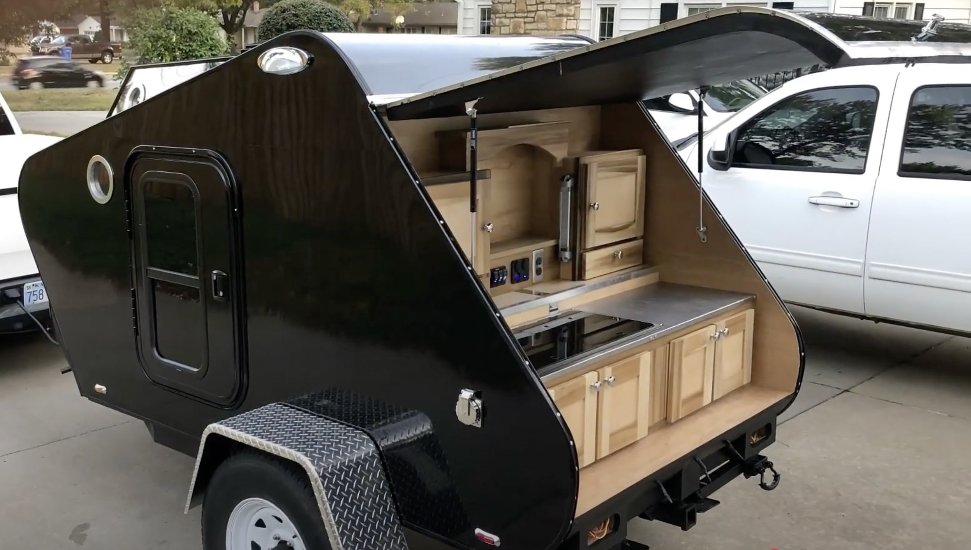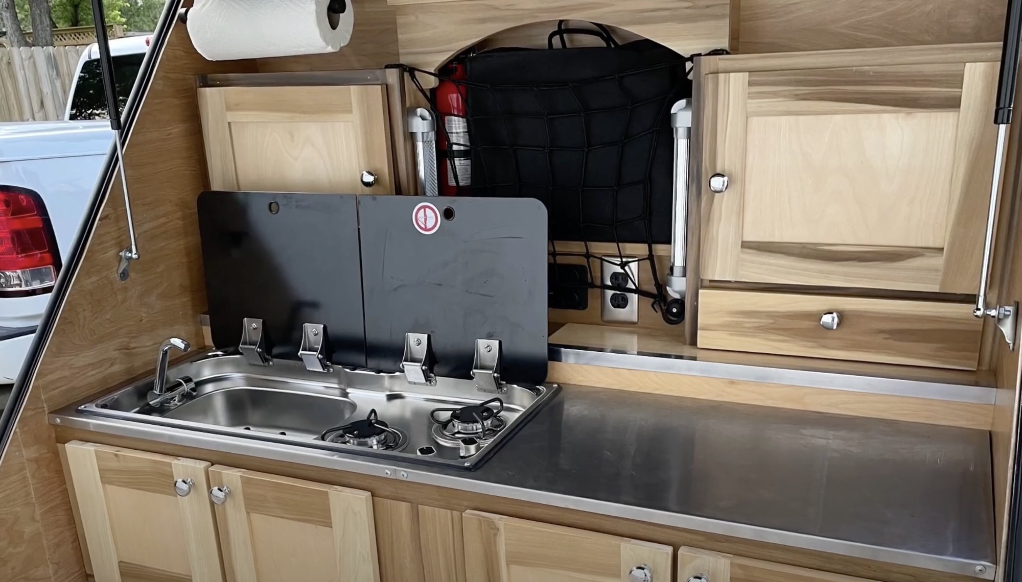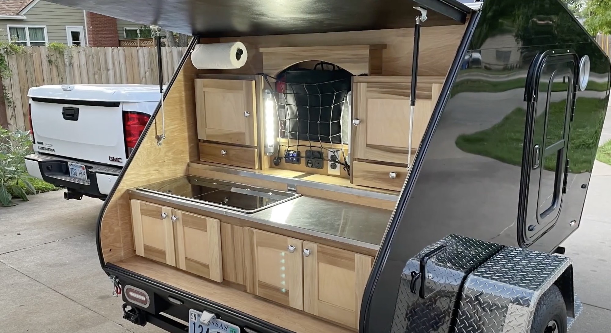 Không chỉ có nhiều không gian lưu trữ, tủ âm tường và các thiết bị điện tử tiện ích cần thiết, mà có cả bếp nấu, bồn rửa, vòi nước, tủ lạnh di động. Tất cả đều nằm bên dưới một cửa sập lớn có thể lật lên tạo thành mái hiên có thể cản bớt những cơn mưa nhẹ.