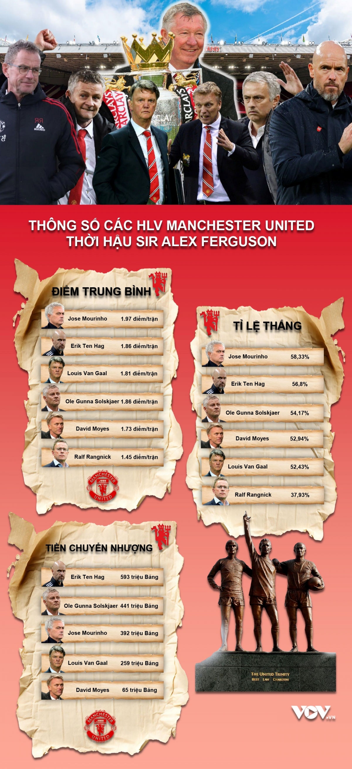 Thông số của các HLV MU thời hậu Sir Alex Ferguson: Bất ngờ với thành tích của HLV Erik ten Hag