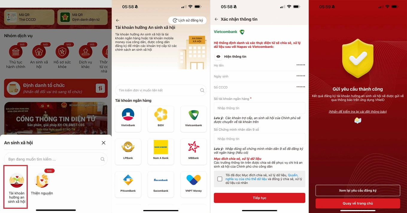 Sau khi đăng nhập, tại giao diện chính của ứng dụng, người dùng chọn mục “An sinh xã hội”, tiếp tục lựa chọn ngân hàng hoặc ví điện tử muốn nhận tiền và thực hiện các bước theo hướng dẫn. Hệ thống sẽ tự động kiểm tra, đối soát thông tin và gửi thông báo khi hồ sơ được phê duyệt.