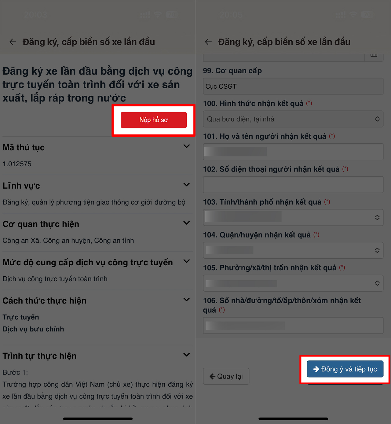 Bước 8: Tại mục số 100 (hình thức nhận kết quả), người dùng nên chọn nhận qua bưu điện để biển số được gửi về tận nhà, không cần đi lại, sau đó nhấn Đồng ý và tiếp tục.