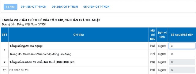 Bước 9: Người nộp thuế cập nhập biểu “Tờ khai” gồm: Tổng số người lao động; số cá nhân cư trú có hợp đồng lao động.