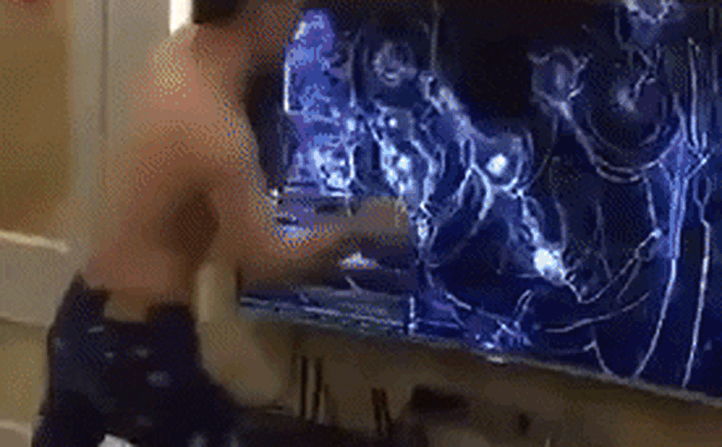 Chưa dừng lại ở đó, anh chàng còn ném chiếc tivi nát màn hình xuống đất rồi ra sức giẫm đạp để "xả cục tức" trong lòng.