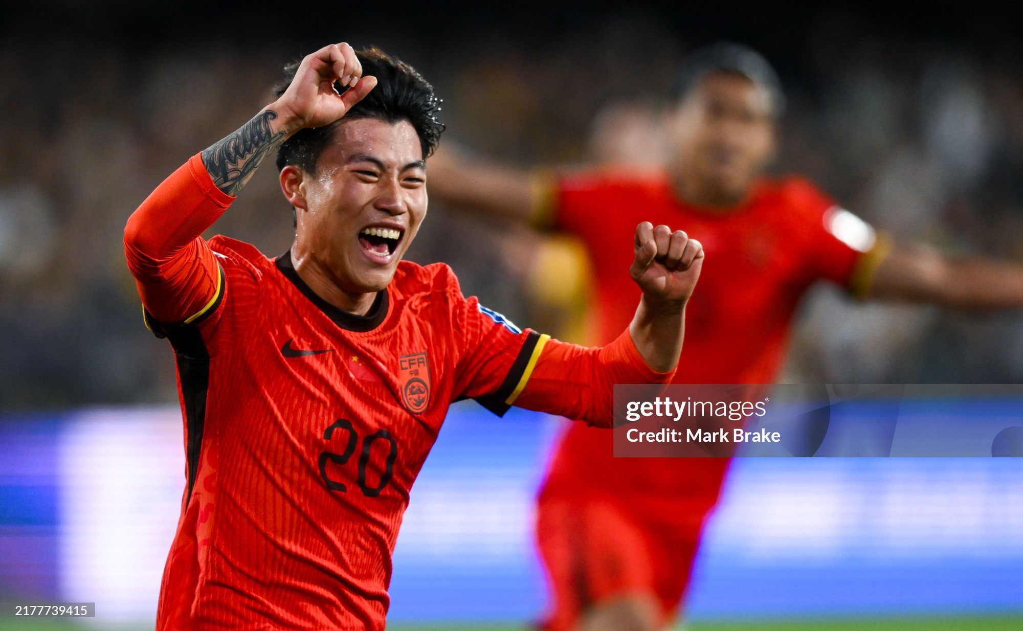 Xie Wenneng ăn mừng bàn mở tỉ số cho đội tuyển Trung Quốc.