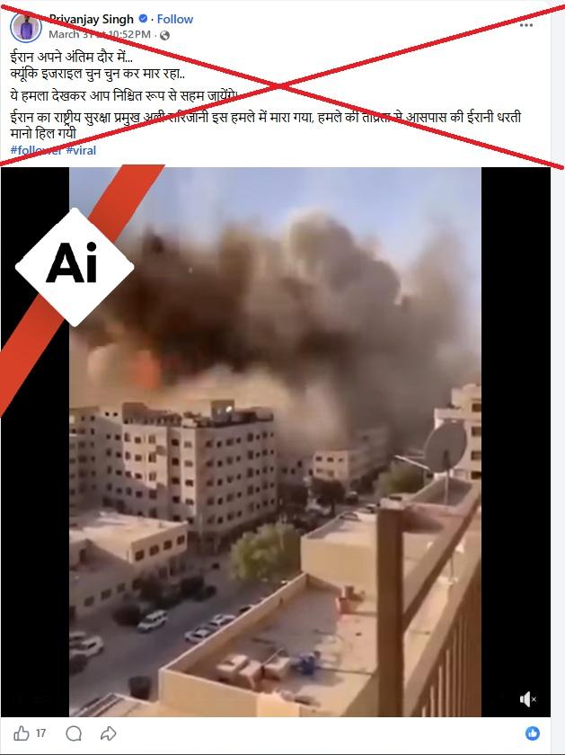 "Cuộc tấn công này chắc chắn sẽ khiến các bạn kinh hãi. Thư ký Hội đồng An ninh Quốc gia Tối cao Iran Ali Larijani đã thiệt mạng trong cuộc tấn công này. Sức mạnh của cuộc tấn công đã làm rung chuyển cả những khu vực xung quanh tại Iran", đó là một phần nội dung chú thích bằng tiếng Hindi (Ấn Độ) của một video được chia sẻ trên Facebook vào ngày 31.3.