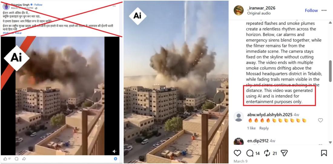 So sánh ảnh chụp màn hình của video được chia sẻ sai sự thật (trái) và video trên Instagram vào ngày 10.3, với biểu tượng AI được AFP thêm vào và dòng chữ cảnh báo về AI được làm nổi bật