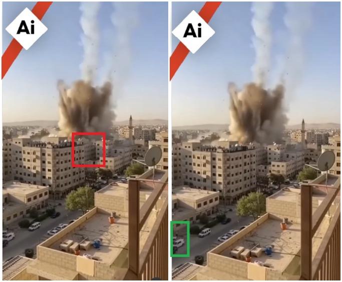 Ảnh chụp màn hình của video được chia sẻ sai sự thật, cho thấy các tòa nhà không bị hư hại và một người đang đi bộ bình tĩnh giữa cuộc không kích, được AFP đánh dấu