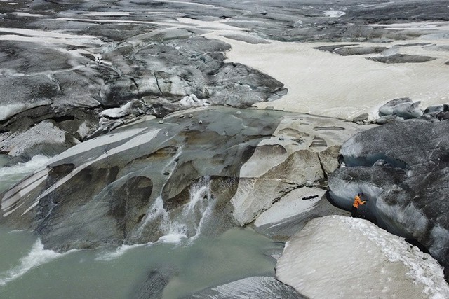 Tiếng “chảy tí tách” vang lên từ sông băng Rhone khi mặt băng tan rã, đang được các nhà khoa học, như ông Matthias Huss tại ETH Zurich, theo dõi kỹ lưỡng để phát hiện dấu hiệu rút lui của băng cao nguyên khi toàn cầu ấm lên.