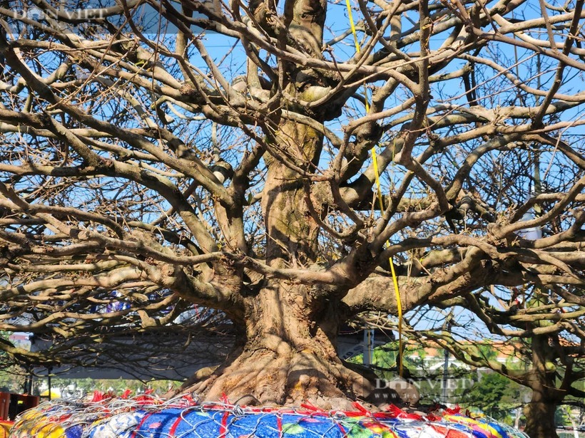 Cây mai gây ấn tượng mạnh bởi kích thước vượt trội so với các loại mai thông thường. Gốc cây có đường kính khoảng 2,5m, tạo thành bệ đỡ vững chãi.