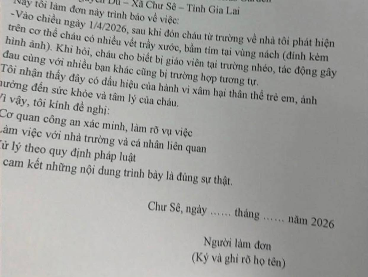 Đơn khuyếu nại của gia đình về sự việc bé Audi bị tác động ở trường.