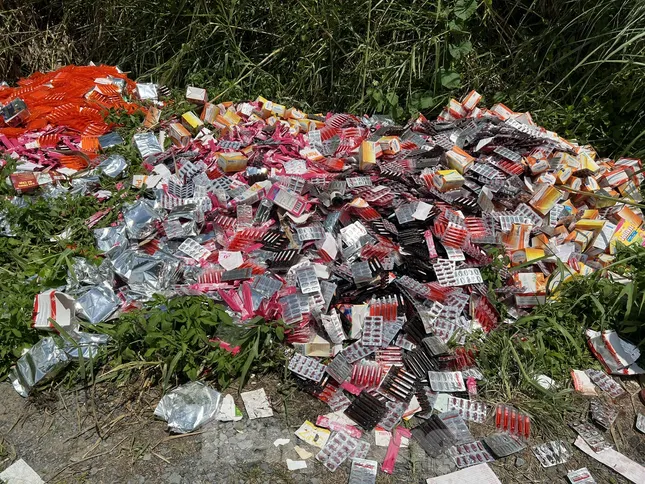 Bước đầu, lực lượng chức năng ghi nhận có 5 nơi vứt thuốc, thực phẩm chức năng dành cho người lớn và trẻ em . Trên bao bì có các loại thuốc, thực phẩm chức năng như Ginlobil, Vitamin A-D, Nattobet, Homramin Ginseng… Ngoài 5 nơi trên còn có một bãi đã được đốt cháy hoàn toàn với diện tích khoảng 20 m2.