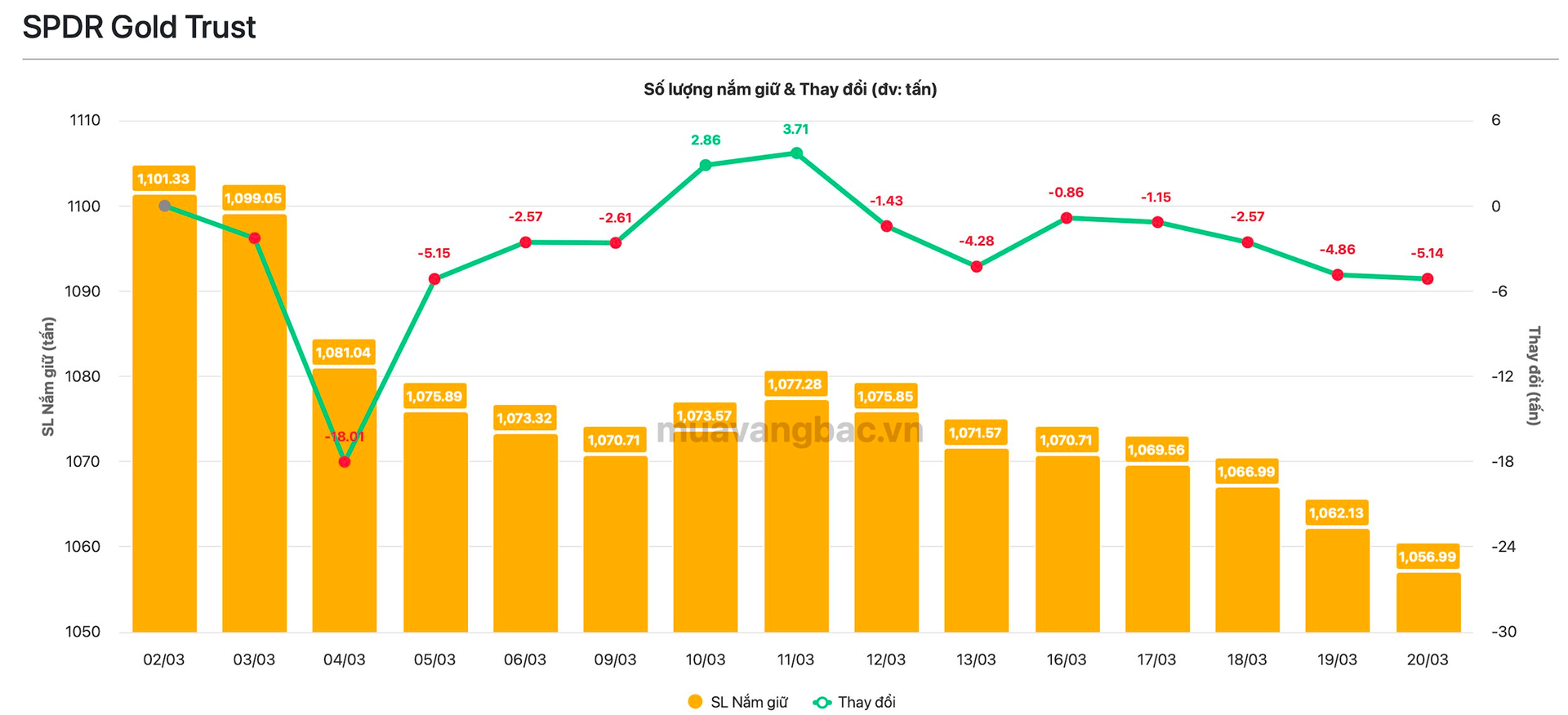 Áp lực bán ra không nhỏ đến từ quỹ vàng lớn nhất thế giới SPDR Gold Trust. Theo dữ liệu từ Muavangbac.vn, SPDR đã bán ròng 7 phiên liên tiếp với tổng khối lượng hơn 20 tấn, giảm tổng lượng nắm giữ xuống còn 1.057 tấn. Lực bán có dấu hiệu gia tăng cho thấy mức độ thận trọng của quỹ trước những biến động khó lường có thể xảy ra trong 2 ngày cuối tuần.