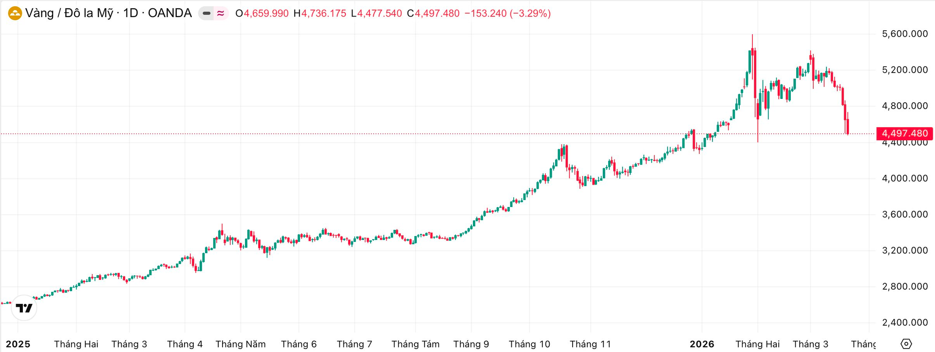 Trong bối cảnh tình hình căng thẳng Trung Đông vẫn chưa có dấu hiệu hạ nhiệt, giá vàng thế giới đã liên tục giảm mạnh trước lo ngại về một cuộc khủng hoảng năng lượng và sự mạnh lên của USD. Giá vàng đã giảm 15% từ đầu tháng 3 xuống dưới 4.500 USD/oz, mức thấp nhất kể từ cuối năm 2025.