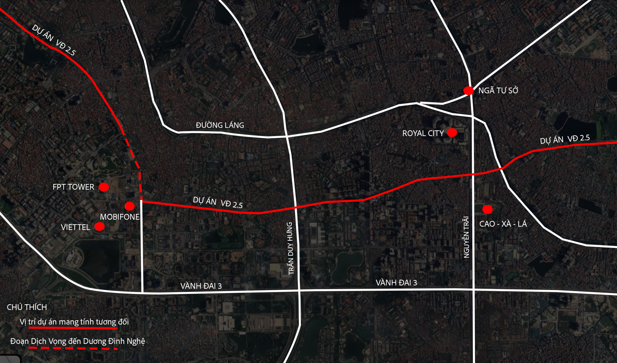 Hà Nội đã khởi công dự án đường Vành đai 2,5 theo diện công trình khẩn cấp, với ba đoạn tuyến dài tổng cộng khoảng 2,26km, đi qua các phường Cầu Giấy, Yên Hòa và Thanh Xuân. Trong đó, đoạn từ Khu đô thị mới Dịch Vọng đến Dương Đình Nghệ dài khoảng 710 m, mặt cắt 50m; đoạn Vũ Phạm Hàm – Trần Duy Hưng dài 600 m, rộng 40m; và đoạn Ngụy Như Kon Tum – Nguyễn Trãi dài gần một km, cũng rộng 40m. (Ảnh mang tính tương đối).