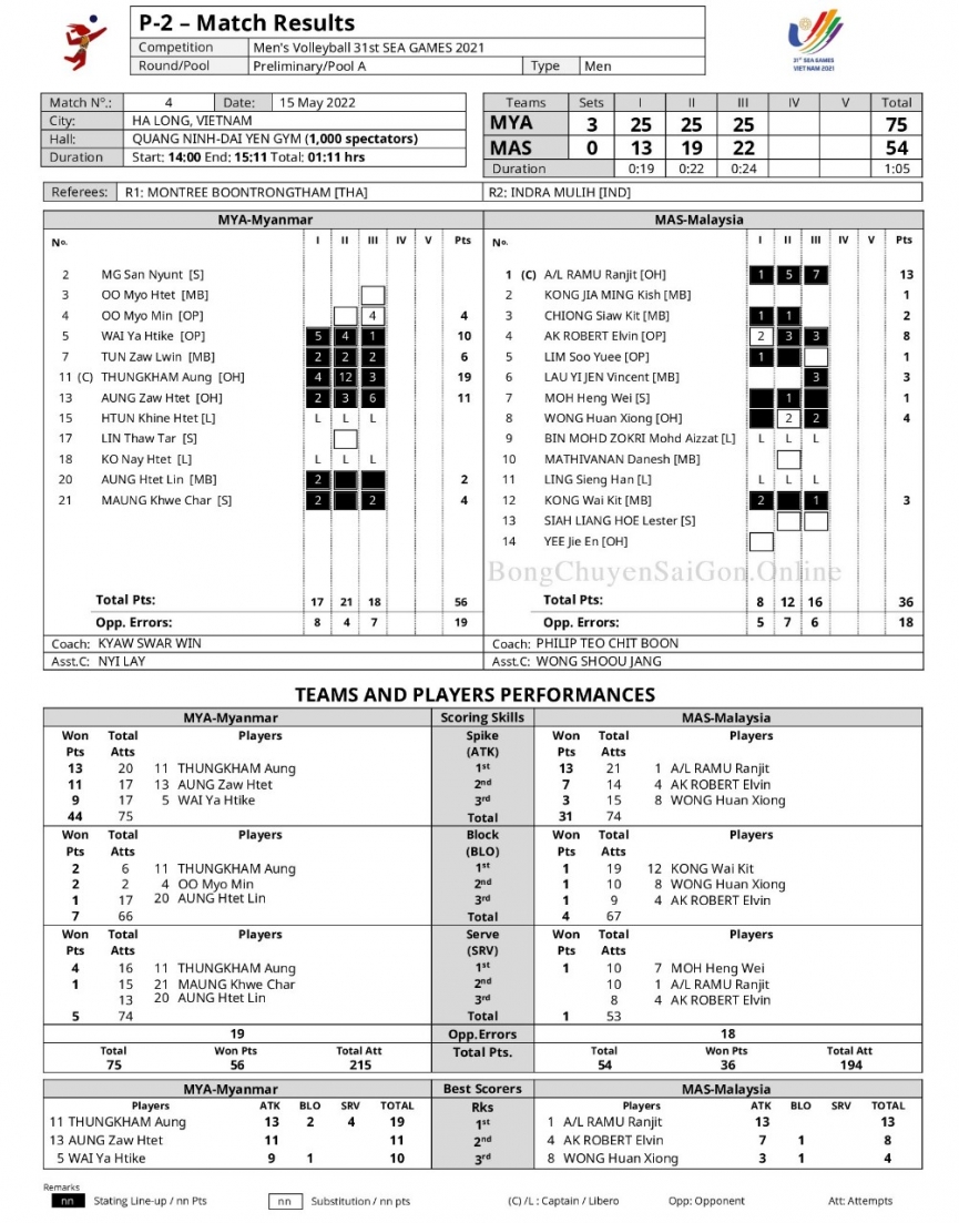 Trước đối thủ bị đánh giá yếu hơn, đội tuyển bóng chuyền nam Myanmar đã mang về chiến thắng chóng vánh 3-0 trước Malaysia (25-13, 25-19, 25-22). Tuy nhiên, điều này là chưa đủ để các chàng trai Myanmar góp mặt tại bán kết.