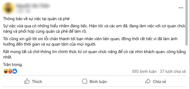 Anh T. viết, "Thông báo về sự việc tại quán cà phê.