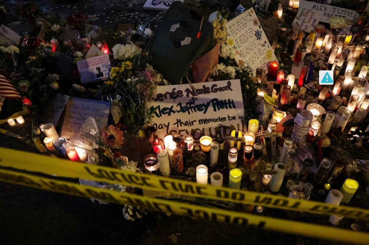Nến và hoa được đặt ở nơi y tá Alex Pretti bị đặc vụ ICE bắn chết. (Ảnh: Reuters)