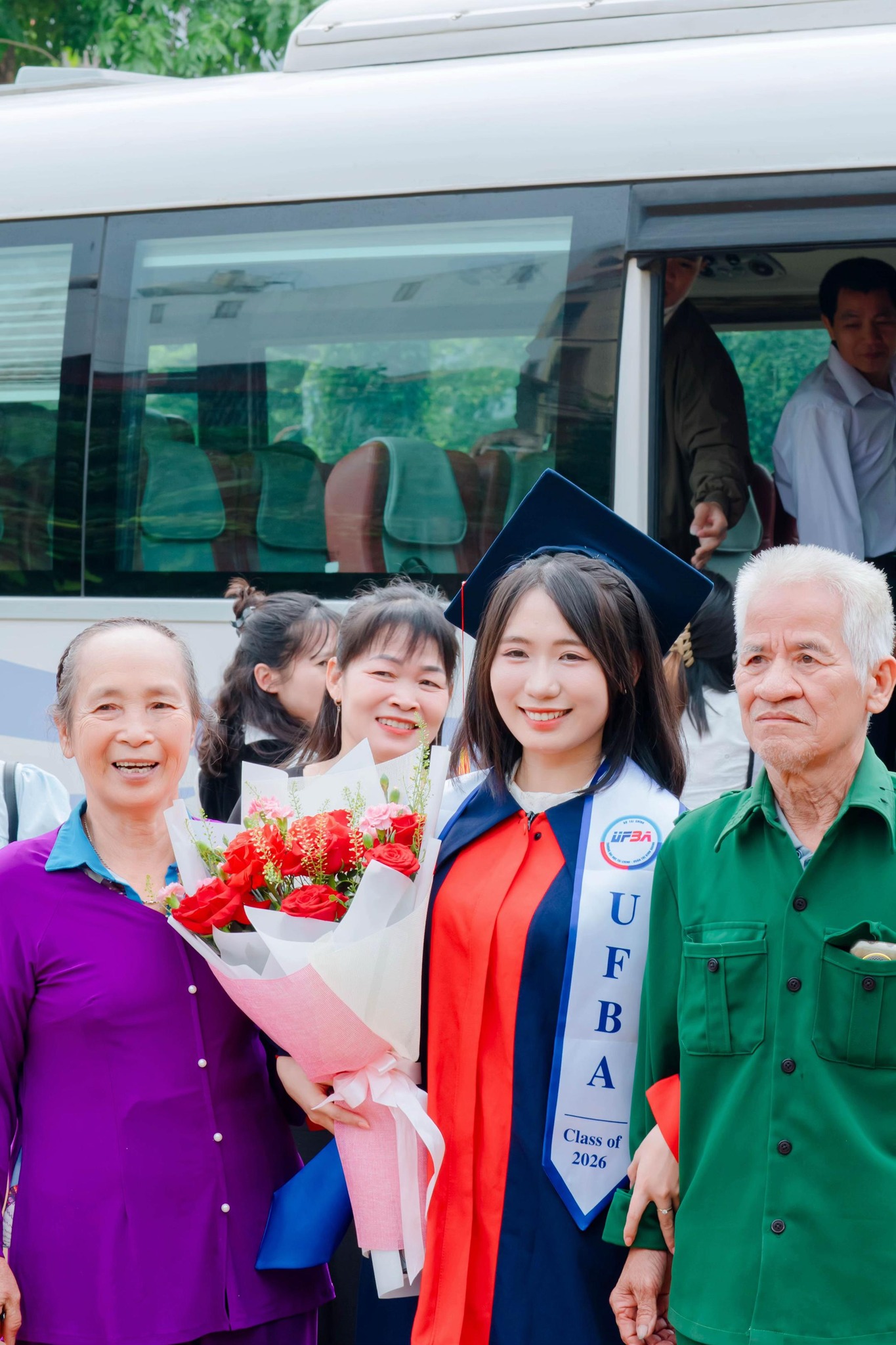 Được biết, nhân vật chính trong câu chuyện là Nguyễn Huyền (sinh năm 2003, Hà Nội). Chia sẻ với Tri Thức - Znews, Huyền cho biết ngay khi biết lịch tốt nghiệp, cô đã chủ động lên kế hoạch và mời đại gia đình cùng tham dự. Nữ sinh đã thuê hẳn một chiếc xe 29 chỗ để đưa mọi người đến dự lễ.