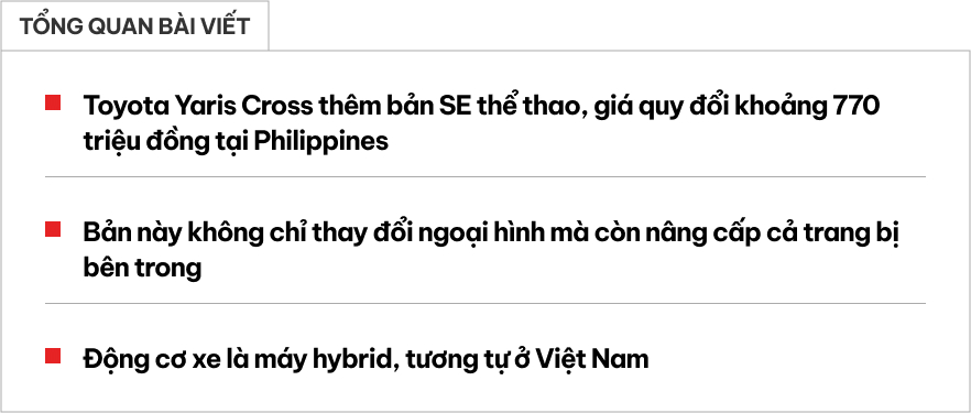 Toyota Motor Philippines (TMP) vừa chính thức giới thiệu Yaris Cross SE HEV - phiên bản hybrid cao cấp nhất của dòng xe này. Tại Philippines, Yaris Cross SE HEV đã chính thức có mặt tại các đại lý Toyota với giá bán lẻ 1.690.000 peso (tương đương khoảng 770 triệu đồng).