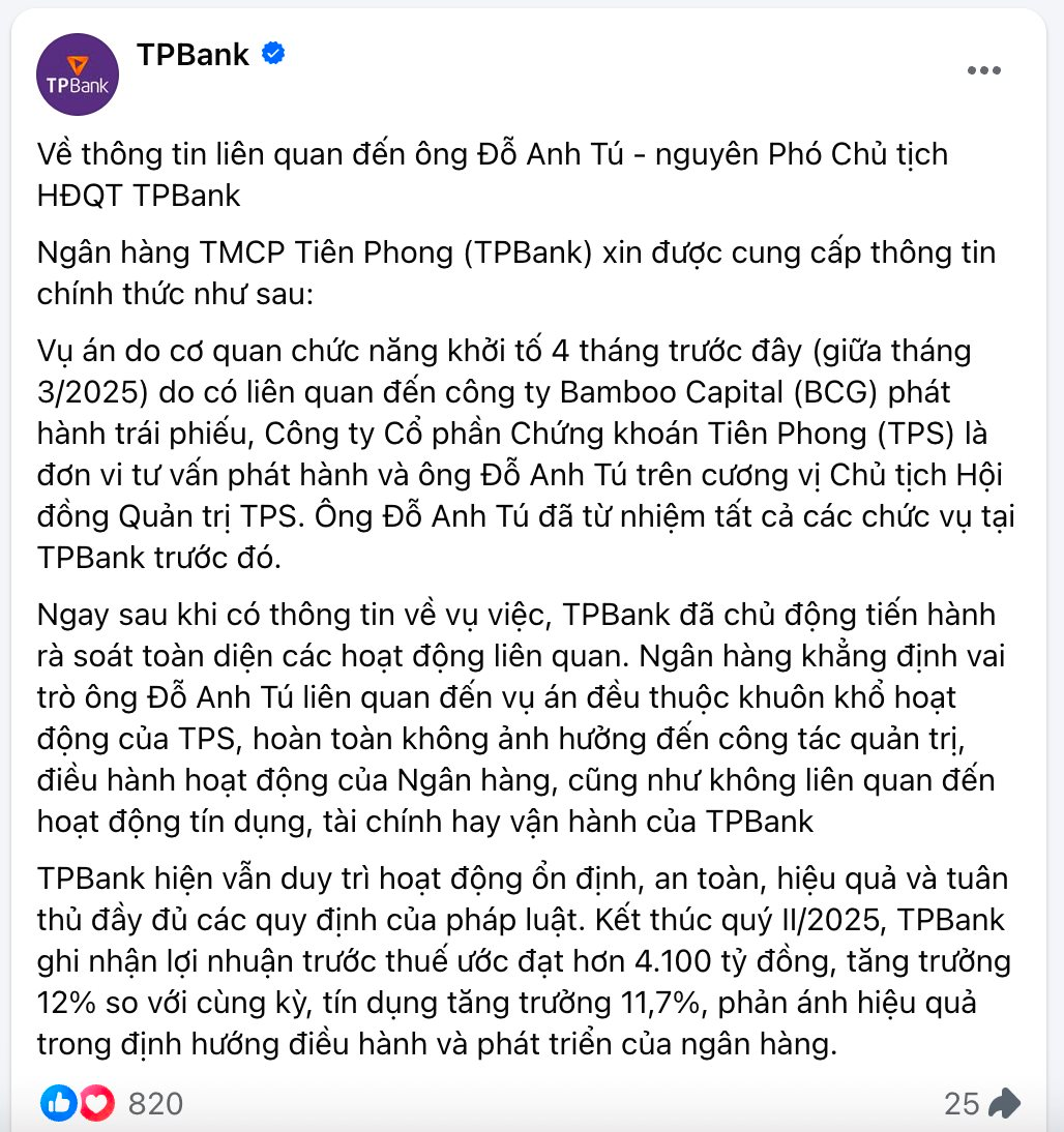 Thông báo của TPBank ghi rõ, vụ án do cơ quan chức năng khởi tố 4 tháng trước đây (giữa tháng 3/2025) do có liên quan đến công ty Bamboo Capital (BCG) phát hành trái phiếu, Công ty Cổ phần Chứng khoán Tiên Phong (TPS) là đơn vi tư vấn phát hành và ông Đỗ Anh Tú trên cương vị Chủ tịch Hội đồng Quản trị TPS. Ông Đỗ Anh Tú đã từ nhiệm tất cả các chức vụ tại TPBank trước đó.