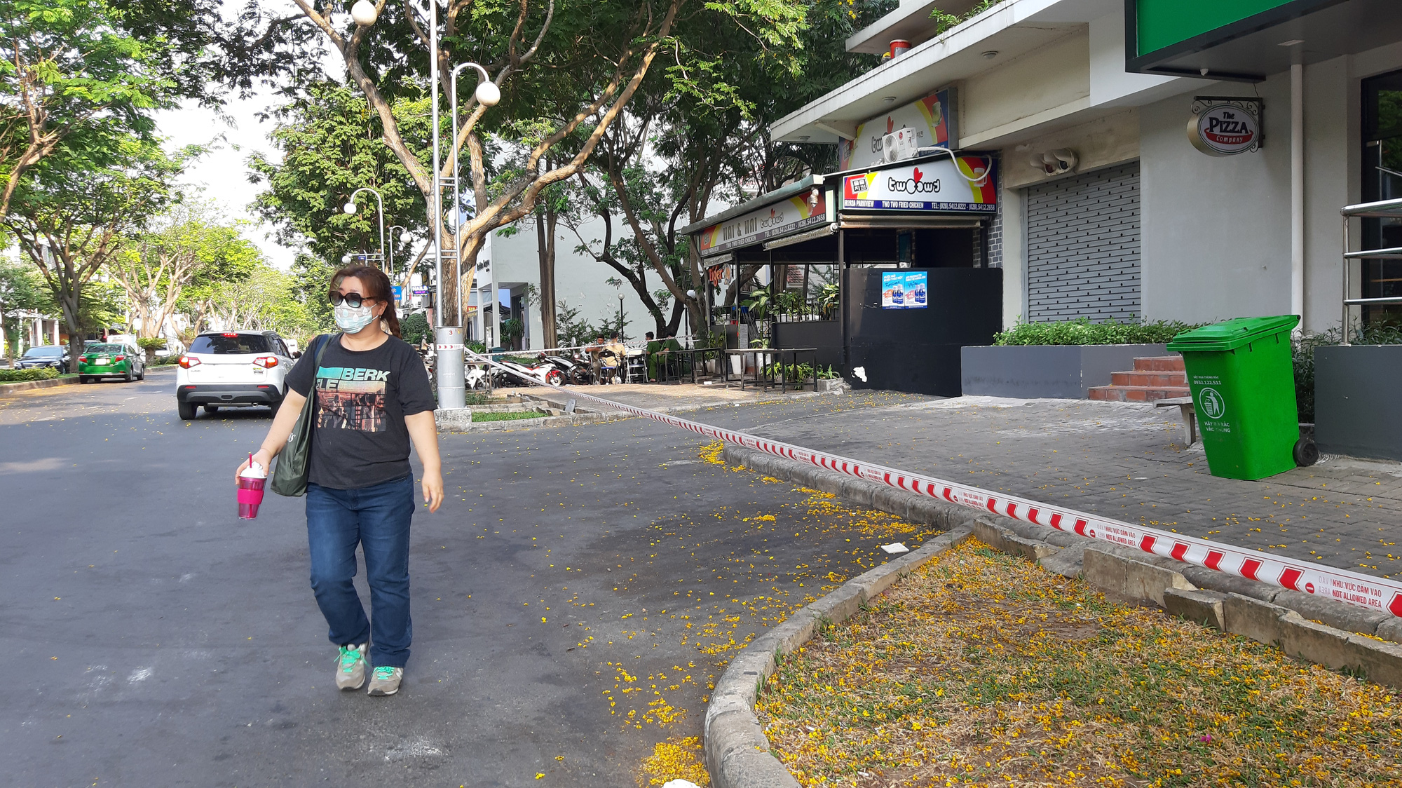 Hiện tại các hàng quán dưới tầng trệt xung quanh chung cư đã đóng cửa, tạm dừng hoạt động sau khi được cơ quan chức năng cách ly phòng chống dịch Covid-19.