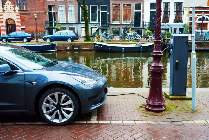 Xe điện đang sạc tại một trạm bên kênh đào ở thủ đô Hà Lan. (Nguồn: Dreamstime)