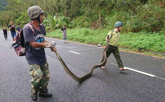 Trăn gấm 4 mét quấn chết khỉ bên vệ đường dưới núi Sơn Trà