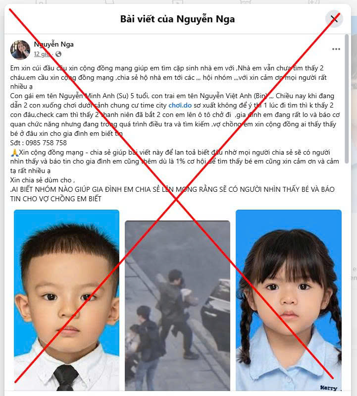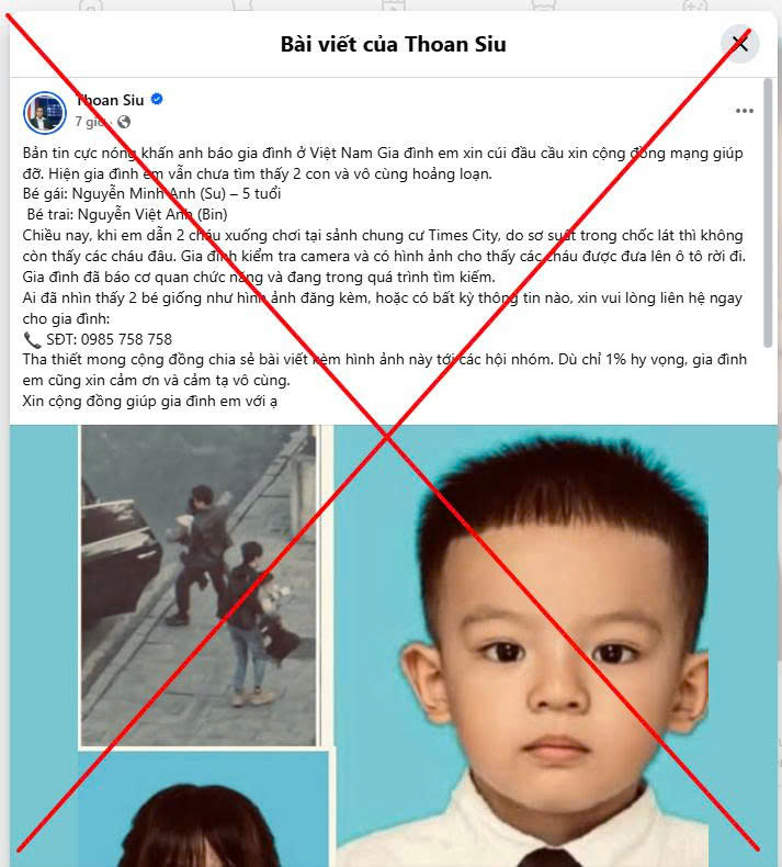 Theo nội dung bài viết, thời gian qua xuất hiện nhiều bài đăng cho rằng đã xảy ra vụ “bắt cóc 2 trẻ em tại khu vực Times City, phường Vĩnh Tuy, quận Hai Bà Trưng, Hà Nội”. Trước những thông tin gây hoang mang dư luận này, Phòng An ninh mạng và phòng, chống tội phạm sử dụng công nghệ cao CATP Hà Nội đã phối hợp với Công an phường Vĩnh Tuy tiến hành xác minh và khẳng định: thông tin nêu trên là hoàn toàn sai sự thật.