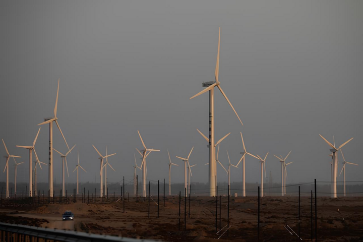 Người đàn ông đạp xe ngang qua trang trại điện gió ở Cam Túc, Trung Quốc. (Ảnh: Stocksy)