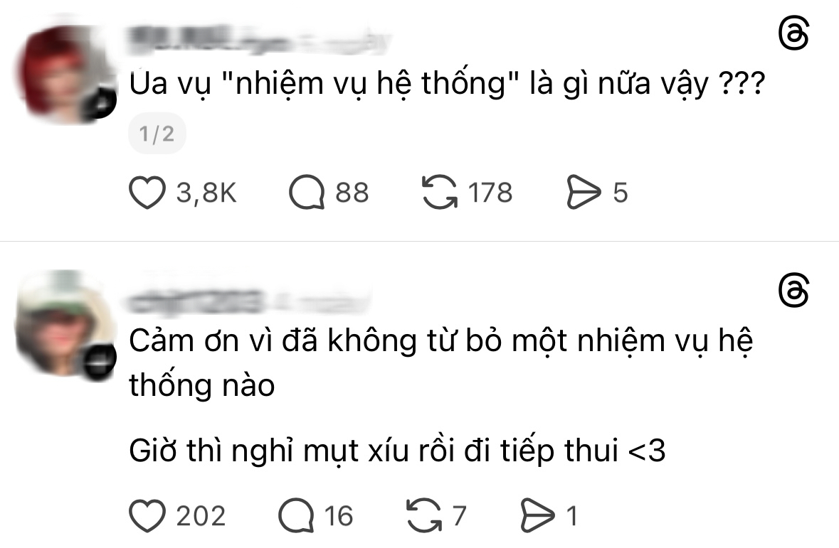 Đồng thời, trend này cũng góp phần tạo ra một dạng “ngôn ngữ chung” trên mạng xã hội. Chỉ cần nhắc đến “nhiệm vụ hệ thống”, người khác gần như lập tức hiểu ngữ cảnh, không cần giải thích dài dòng.
