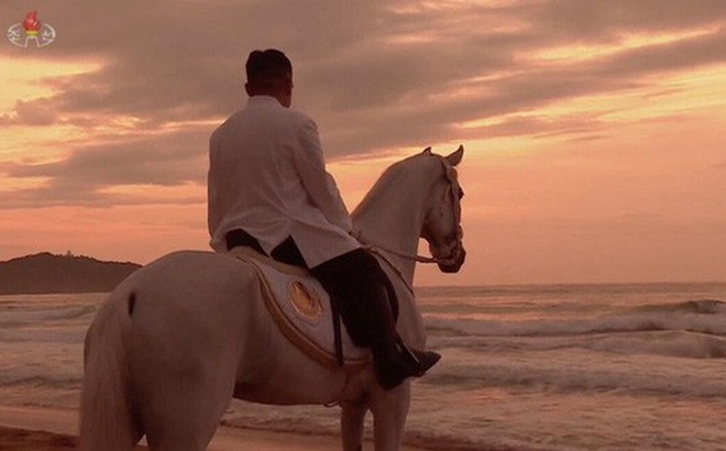 Ông Kim cưỡi ngựa trắng trong bộ phim tài liệu. Ảnh: KCTV