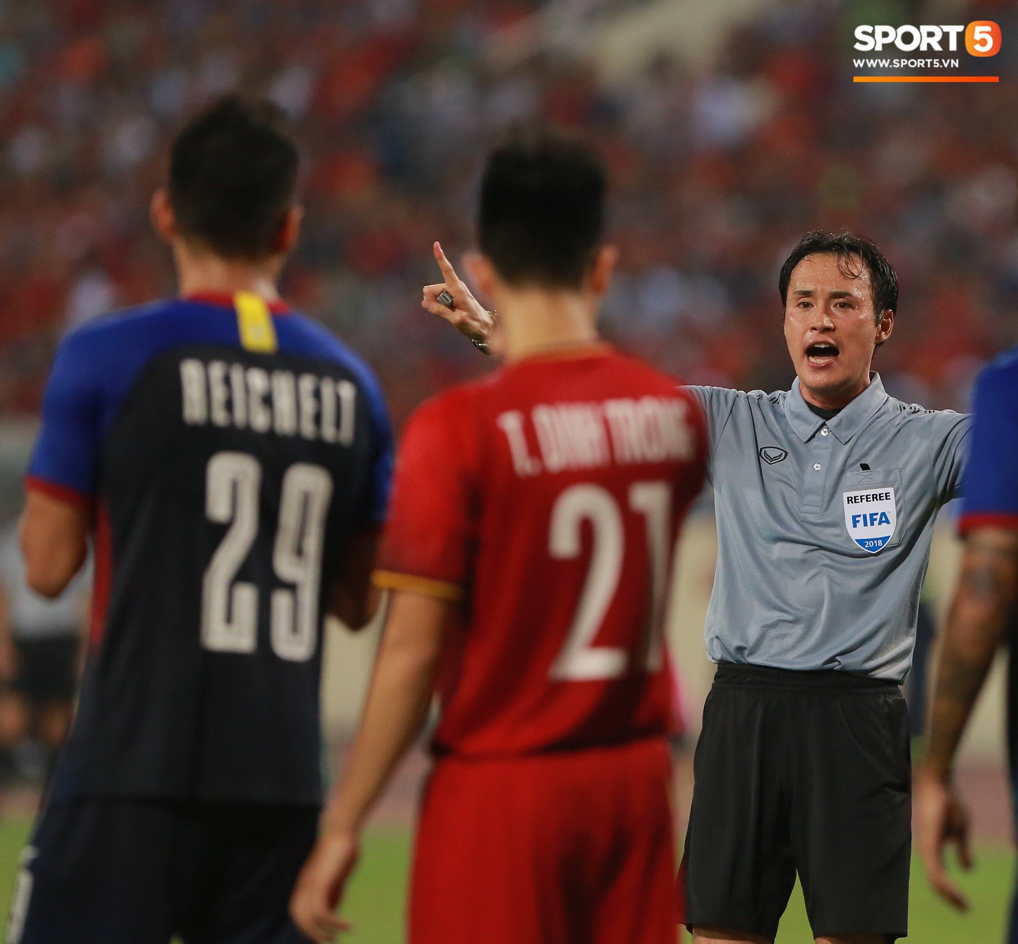 Trước sự máu lửa và "gắt" của Đình Trọng cùng các cầu thủ áo đỏ, trọng tài chính người Nhật Bản đã phải gọi riêng cầu thủ Philippines ra để nhắc nhở. Ảnh: Tùng Lê