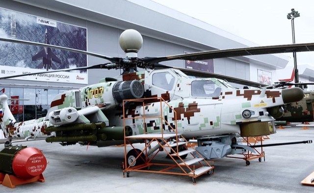 Bức ảnh cho thấy một chiếc trực thăng Mi-28NE được ngụy trang với họa tiết kỹ thuật số. Một kiểu sơn tương tự đã được sử dụng trên chiếc Mi-28NE trưng bày tại diễn đàn Army 2018.