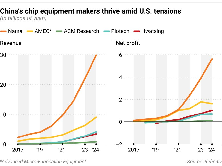 Thực tế là năm nhà sản xuất công cụ chip hàng đầu của Trung Quốc đã phát triển mạnh mẽ kể từ khi căng thẳng Mỹ-Trung leo thang vào năm 2019, với doanh thu kết hợp tăng 473%. Trong mọi bước sản xuất chip ngoại trừ quang khắc, Trung Quốc hiện có những công ty có khả năng thách thức các nhà lãnh đạo toàn cầu.