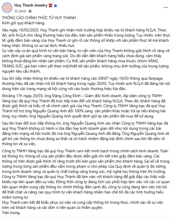 Sau khi tiếp nhận thông tin khiếu nại từ khách hàng, đơn vị đã có thông báo chính thức trên Fanpage. Bài đăng của Huy Thanh Jewelry cụ thể như sau: “Vào ngày 19/3/2025, Huy Thành ghi nhận một trường hợp khiếu nại từ khách hàng N.Q.A. Theo đó, anh N.Q.A cho rằng thương hiệu lừa đảo, bán sản phẩm thiếu trọng lượng. Tuy nhiên, trên thực tế, giấy đảm bảo vàng của Huy Thành có ghi rõ các thông số khớp với sản phẩm thực tế mà khách hàng nhận. Không có sự sai lệch, thiếu hụt.