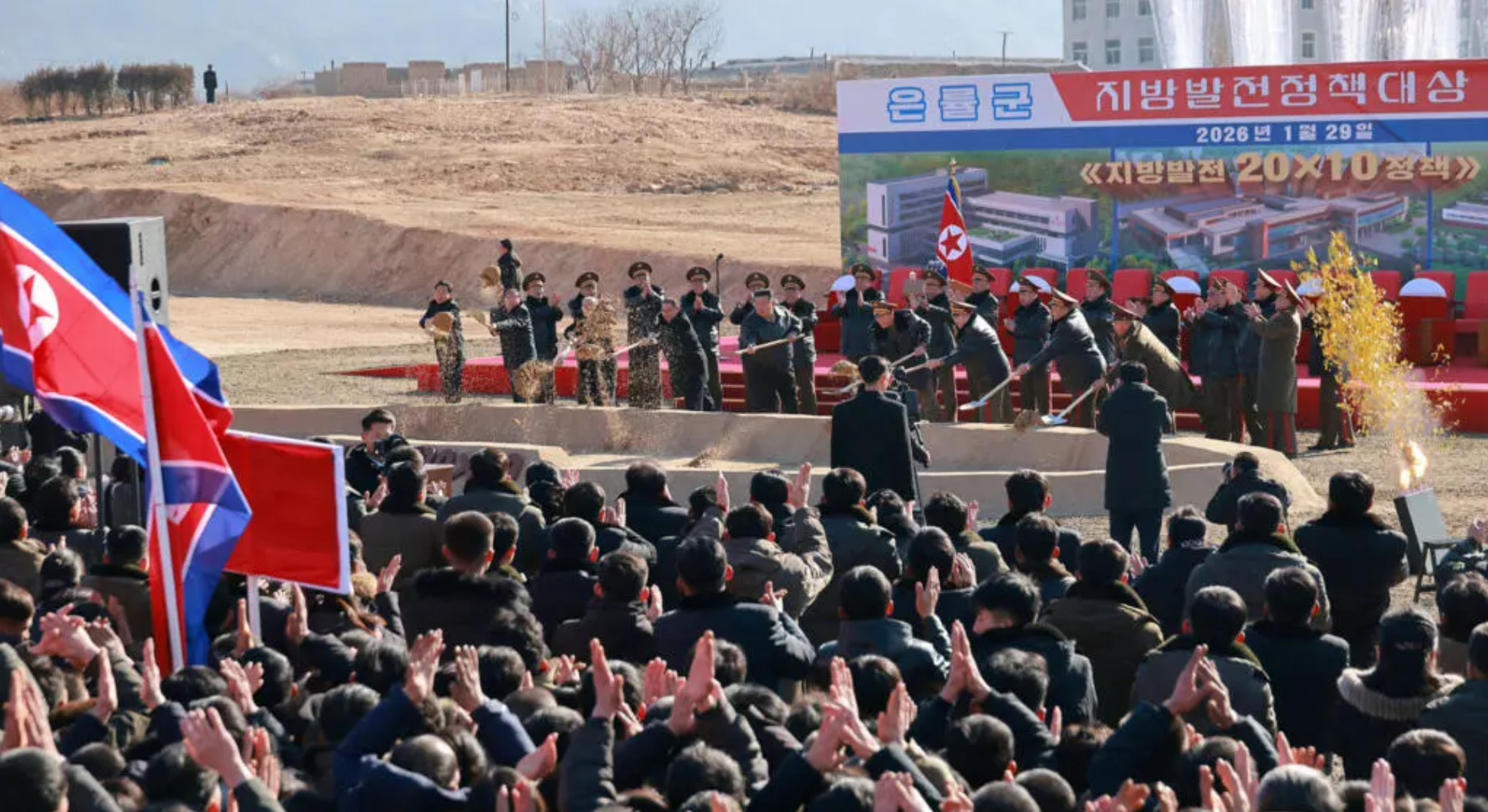 Những hình ảnh do KCNA công bố cho thấy ông Kim xúc đất cùng với các quan chức Triều Tiên khác tại một buổi lễ có sự chứng kiến của một đám đông vỗ tay và vẫy cờ Triều Tiên.