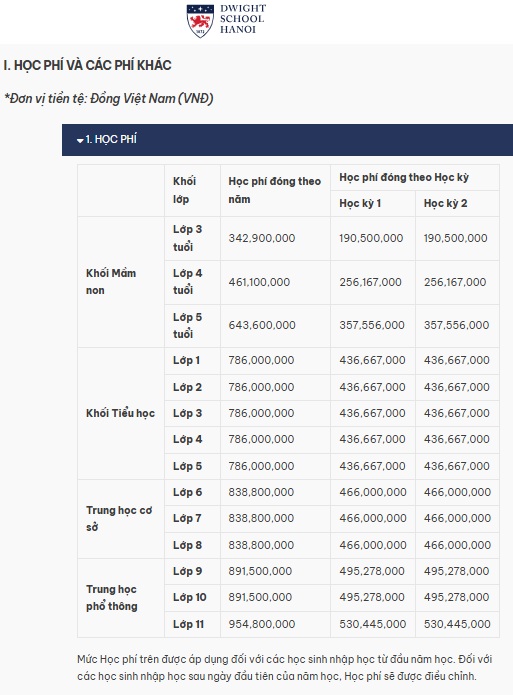 Học phí của trường quốc tế Dwight School Hanoi được cung cấp trên website chính thức của trường. Ảnh chụp màn hình