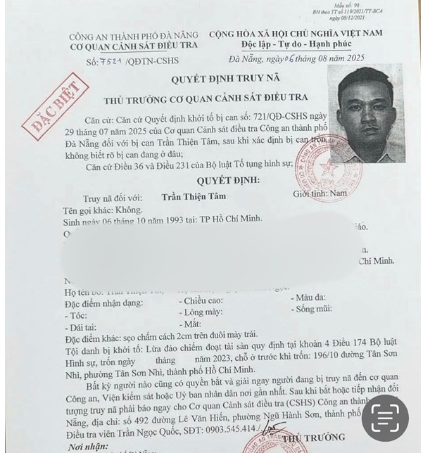 Theo hồ sơ, ngày 29/7/2025, CSĐT Công an TP Đà Nẵng đã khởi tố bị can đối với Tâm về hành vi nêu trên. Tuy nhiên, đối tượng đã bỏ trốn khỏi nơi cư trú. Đến ngày 06/8/2025, Cơ quan điều tra ban hành quyết định truy nã. Hiện, Công an TP Đà Nẵng đề nghị Trần Thiện Tâm ra trình diện để được hưởng chính sách khoan hồng của pháp luật.